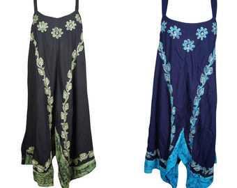 2PC Bohemian Womens Sundress Batik Embroidered Black Flared Hem Swing Sleeveless Summer Tank Dress Cover up M