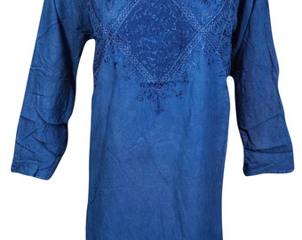 Women's Blue tunic Top Bohochic Scoop Neck Rayon Embroidered Stonewashed Bohemian Dress M