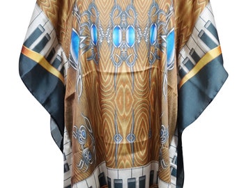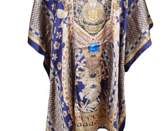 Womens Caftan Dresses, Boho Tunic, Beach Coverup Dresses, Brown Blue Jewel Digital Print Kaftan Dress, Kaftan Resort Dresses One Size L-3XL