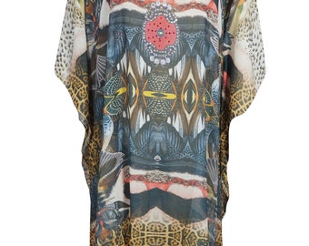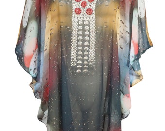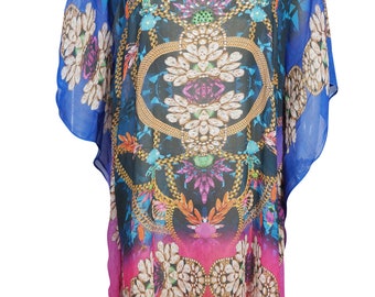Womens Tunic Kaftan Dress, Jewel Print Georgette Kimono Sleeves Beach Cover Up, Loose Sheer Caftan Evening Dresses L-4XL, One Size
