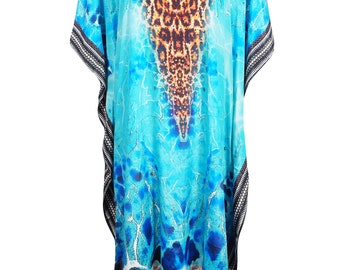 Womens Tunic Kaftan Dress, Blue Animal Print Georgette Kimono Sleeves Beach Cover Up, Resort wear, Gift For Her L-4XL One Size